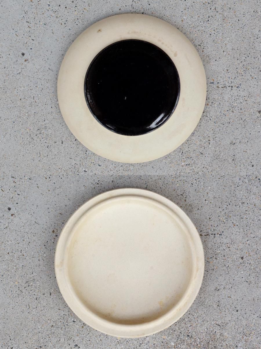全体的には素焼きの肌で、外側面の一部・内側面全面・蓋の天面の黒い部分にのみ透明釉薬が掛けられています。