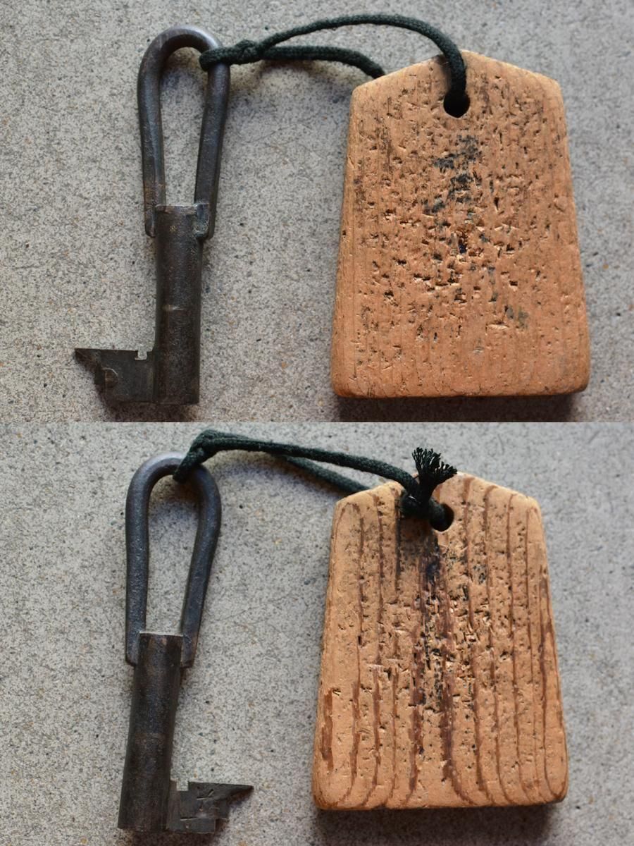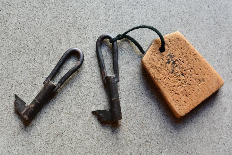 古い蔵の鍵。元々は蔵の名前等が書かれていたであろう木の板と鉄製の鍵2本のセットです。