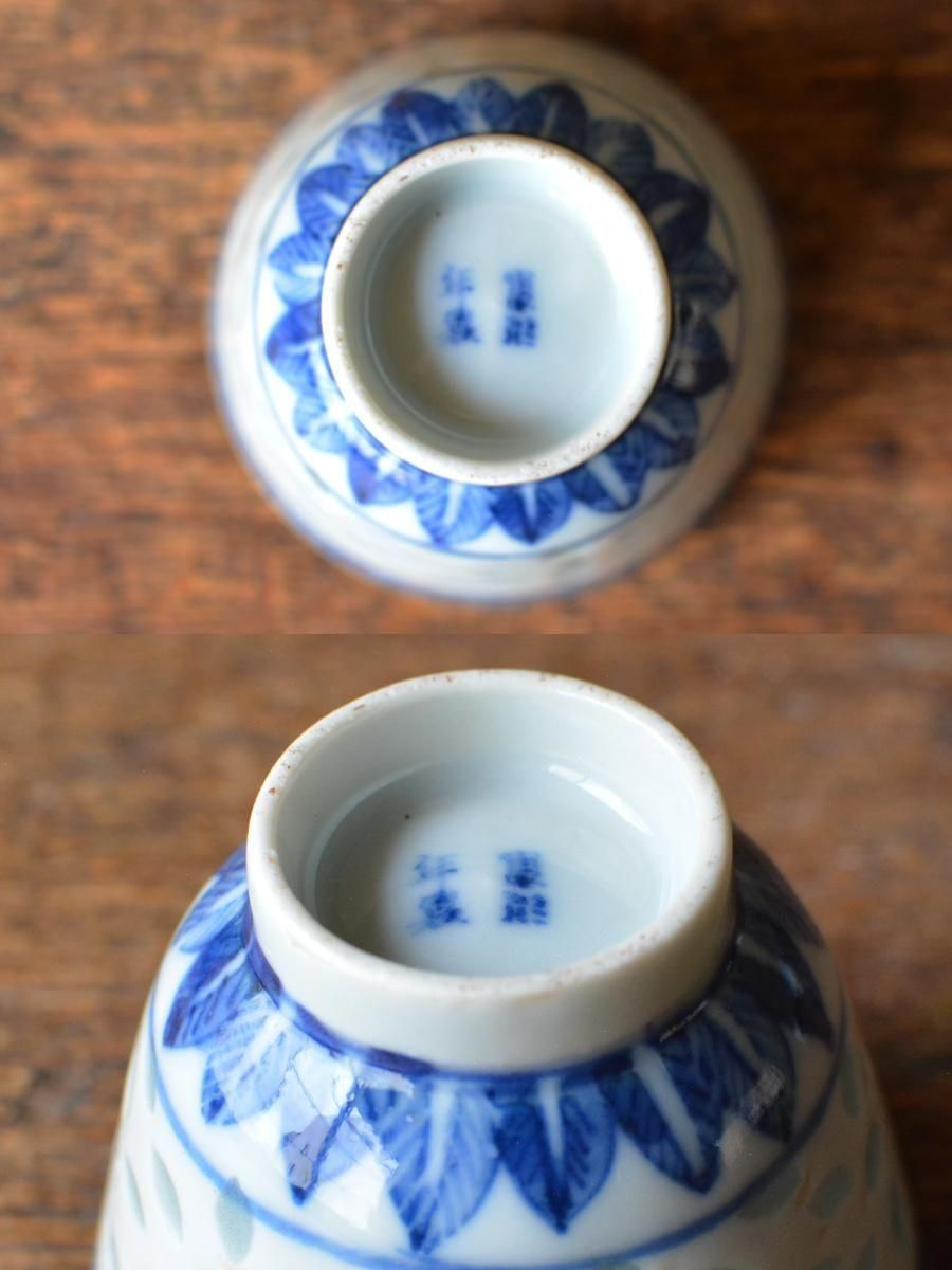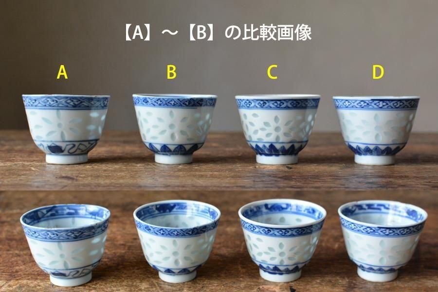 【A】…Aだけが他3客と絵付けが微妙に異なる。外側面の足元部分には蔓と葉、見込み部分にはオモダカが描かれていて、高台内側に書かれた文字も他3客とは異なる。