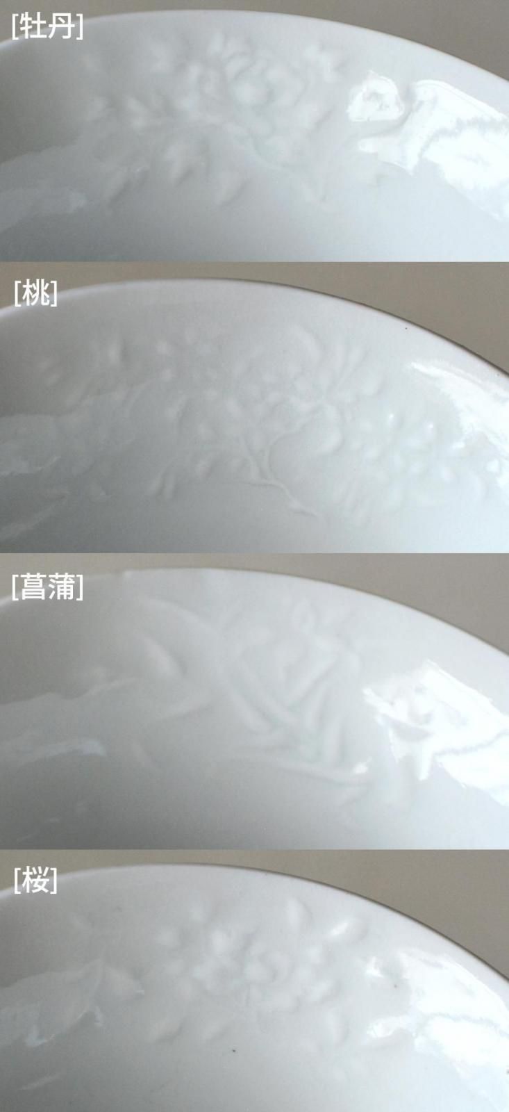 内側縁には牡丹、桃、菖蒲、桜と季節の花がふんわり浮かび上がるような陽刻で表現されています。