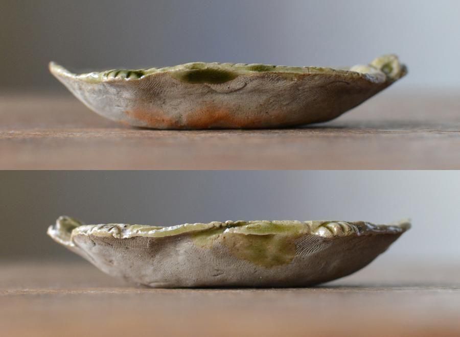 サックリと薄手の造りに、これまた薄く織部釉が掛けられた美しい一皿。
