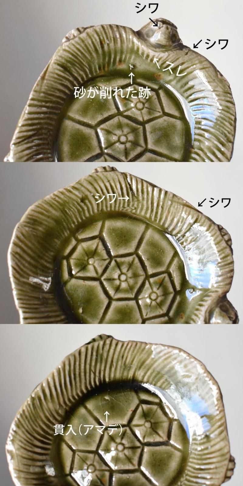 見込み部分のくっきりと盛り上がった甲羅には吉祥文様の一つ「亀甲花菱文様」が。