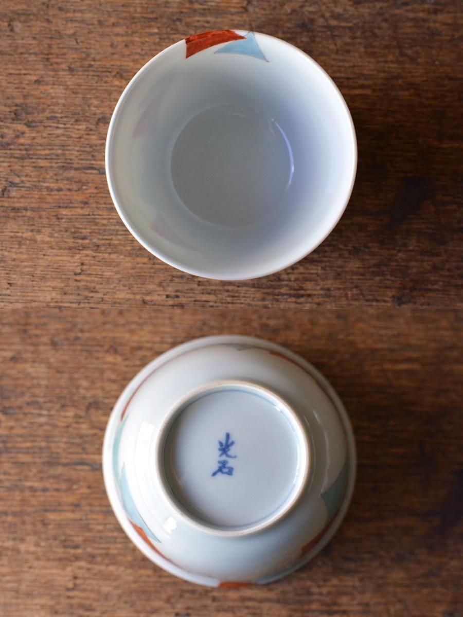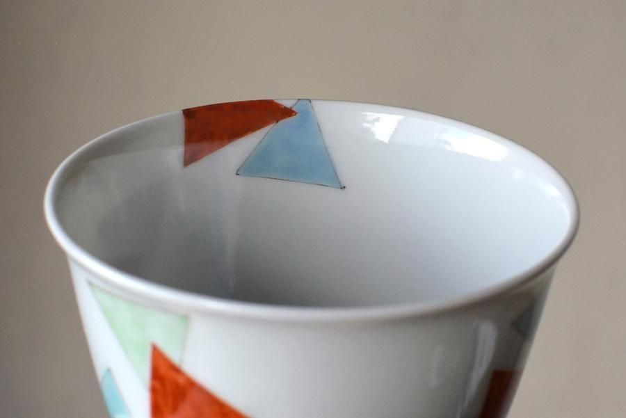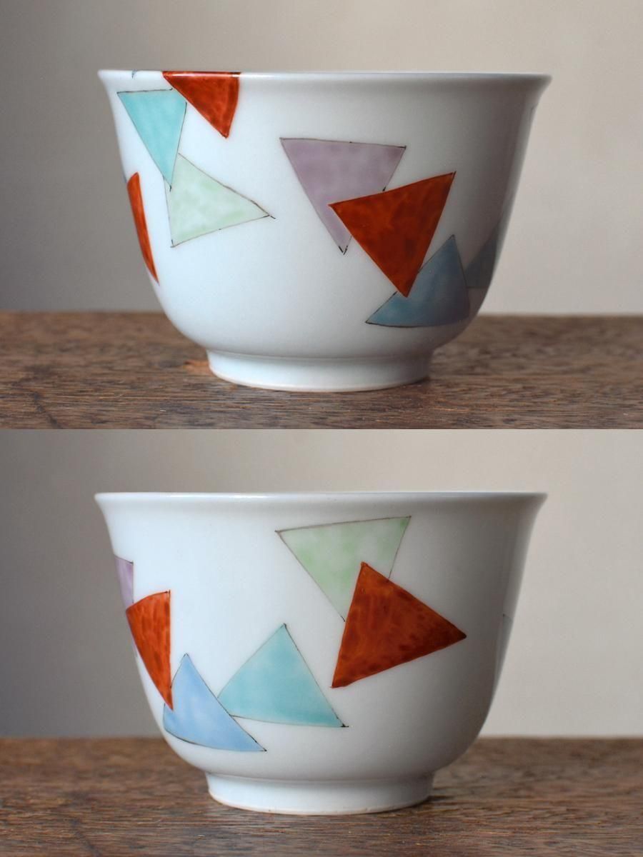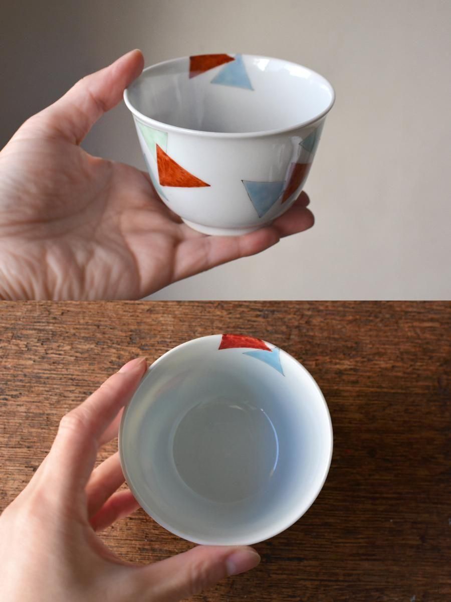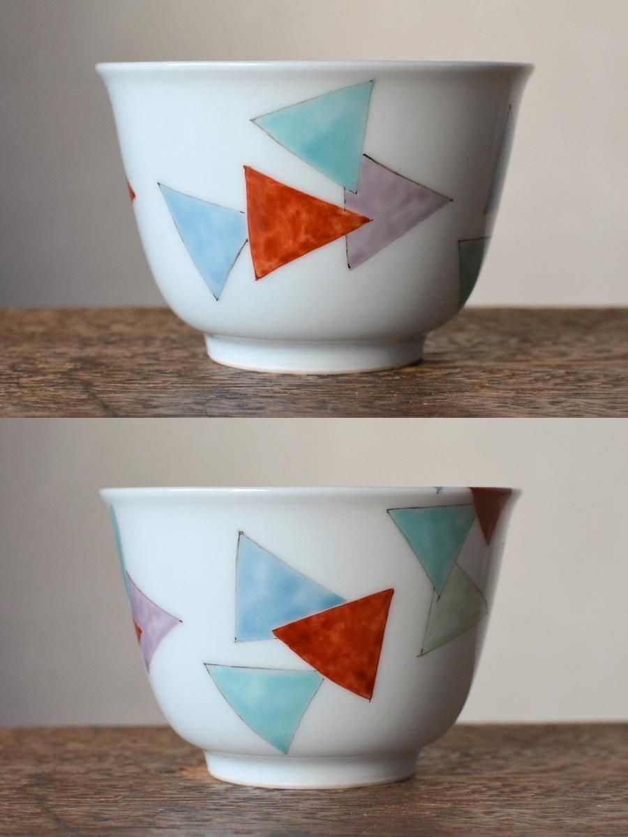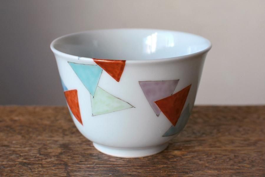 赤・紫・黄緑・緑・青の5色で絵付けされた三角模様がリズミカルに配置された煎茶碗。
