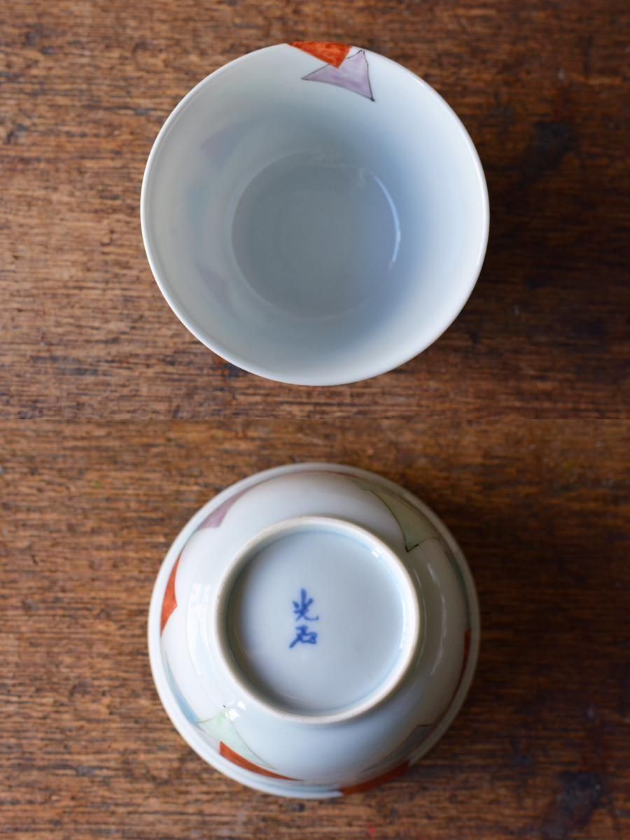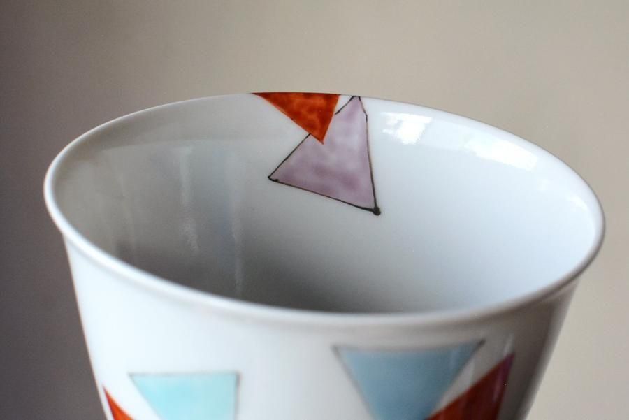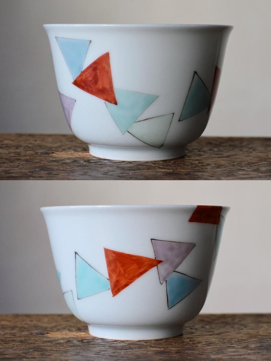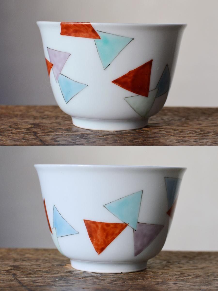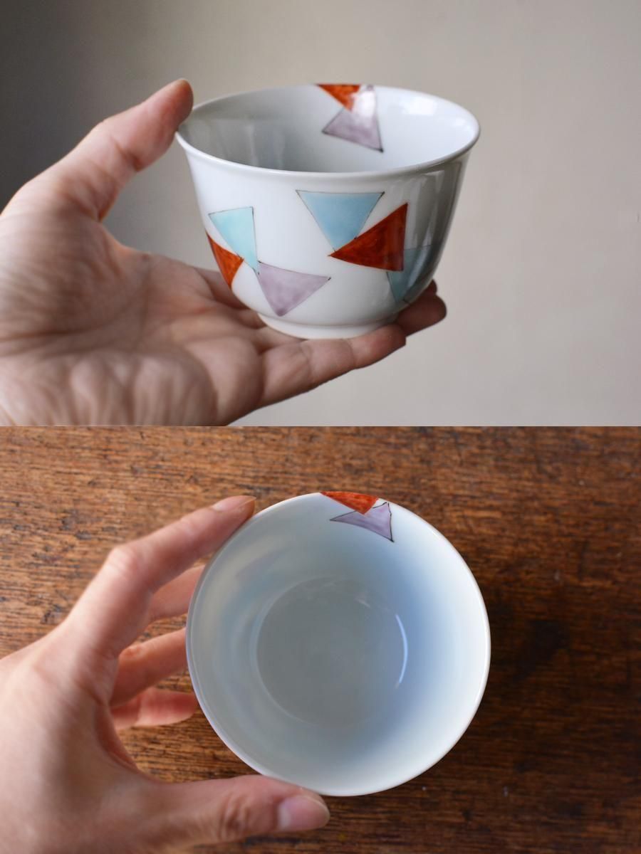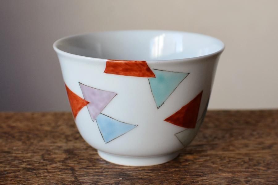 赤・紫・黄緑・緑・青の5色で絵付けされた三角模様がリズミカルに配置された煎茶碗。