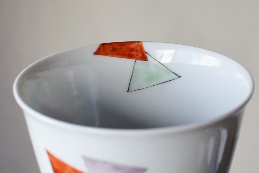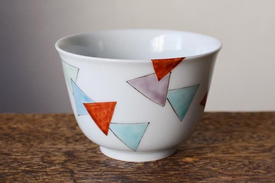赤・紫・黄緑・緑・青の5色で絵付けされた三角模様がリズミカルに配置された煎茶碗。