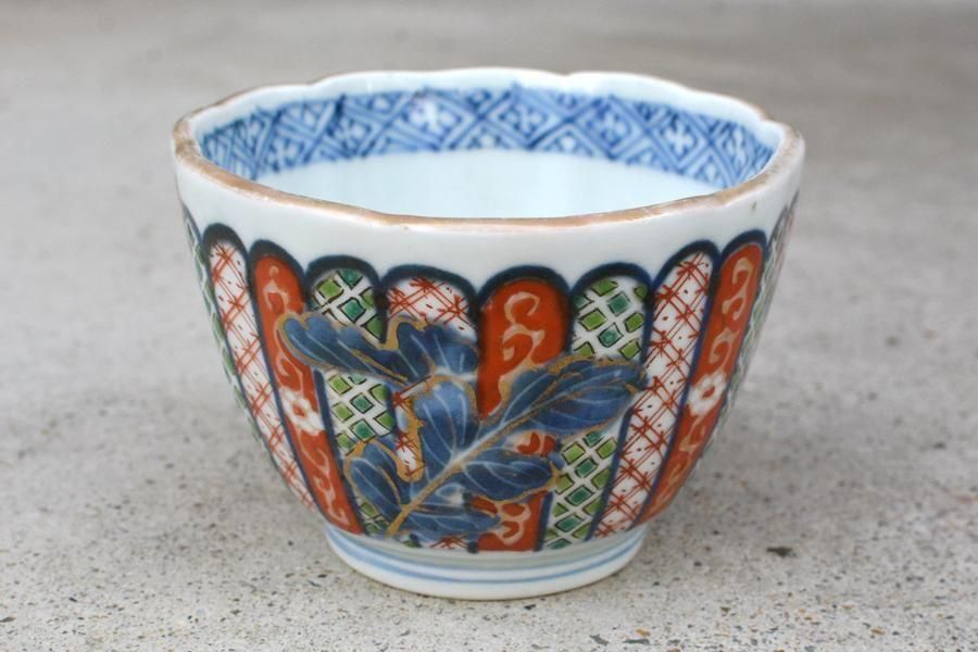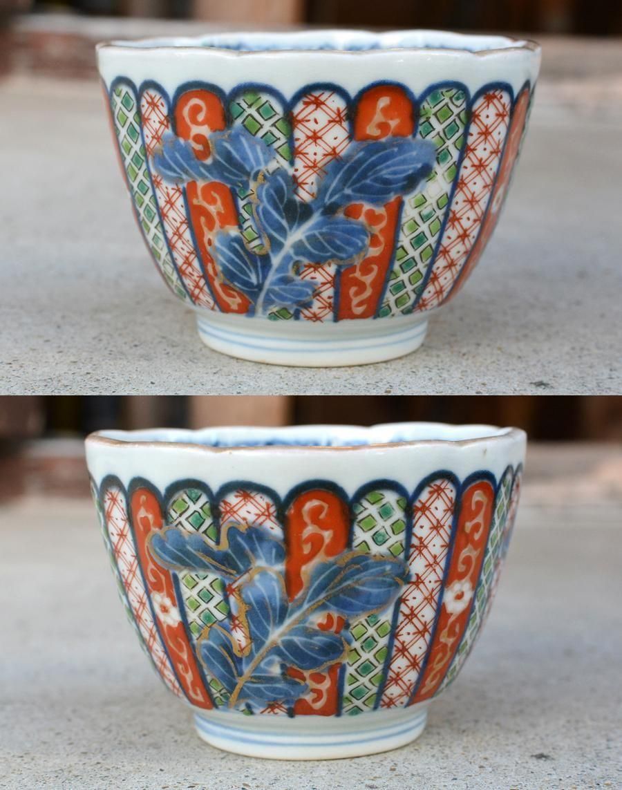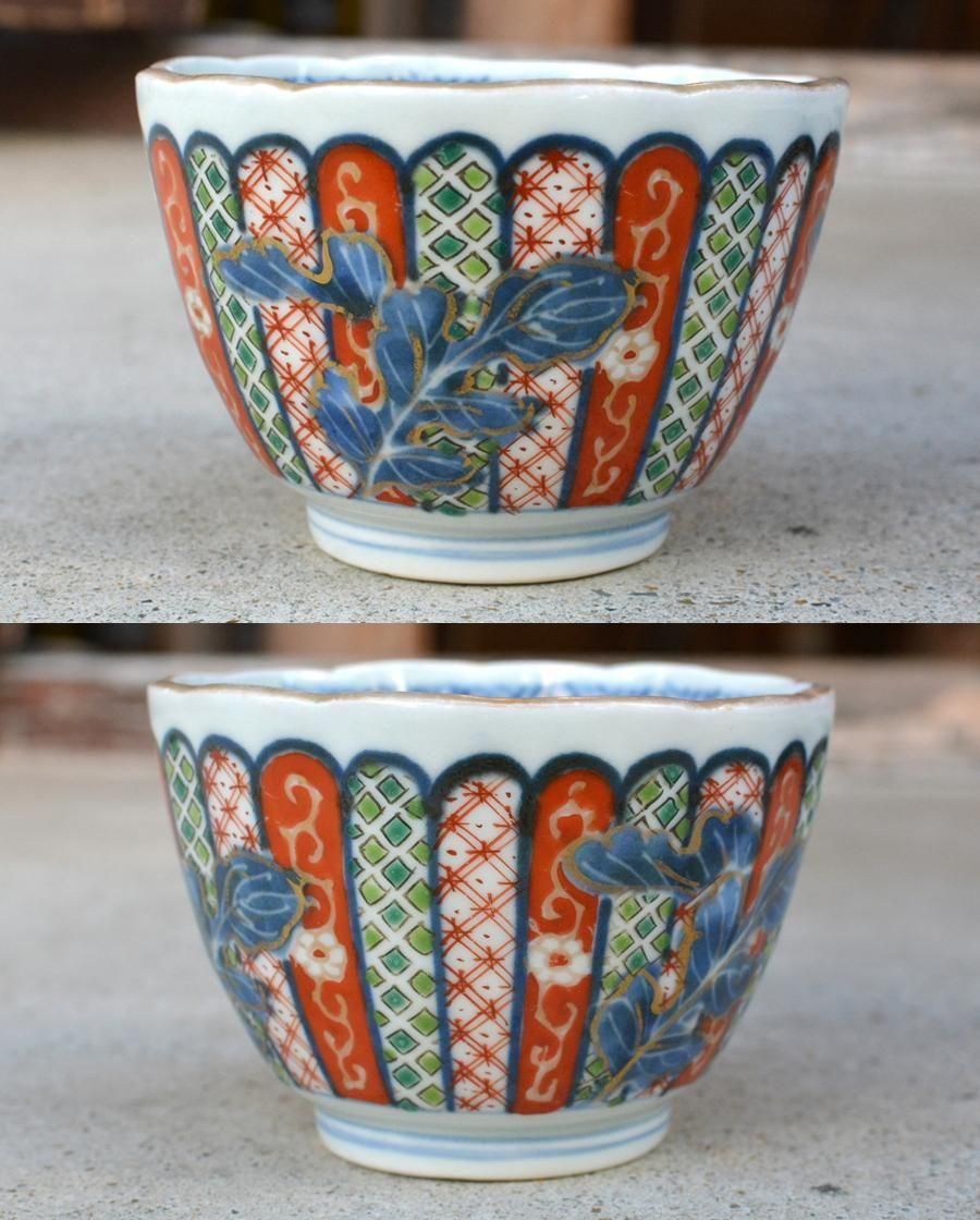 側面は2種類の菱文様と花唐草を背景に菊の葉が、見込みには対い蝶が描かれています。