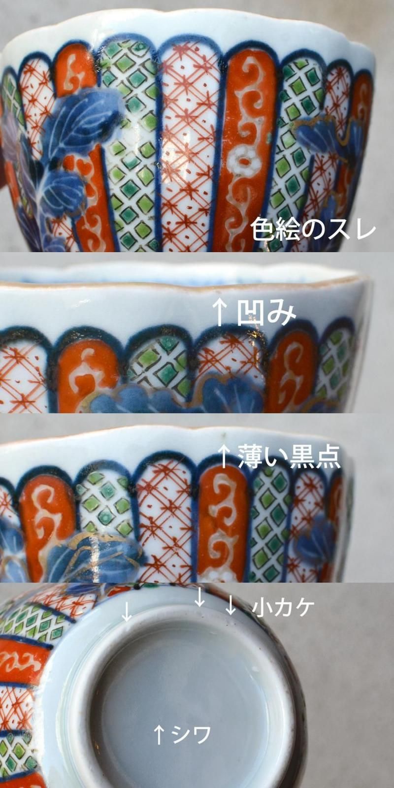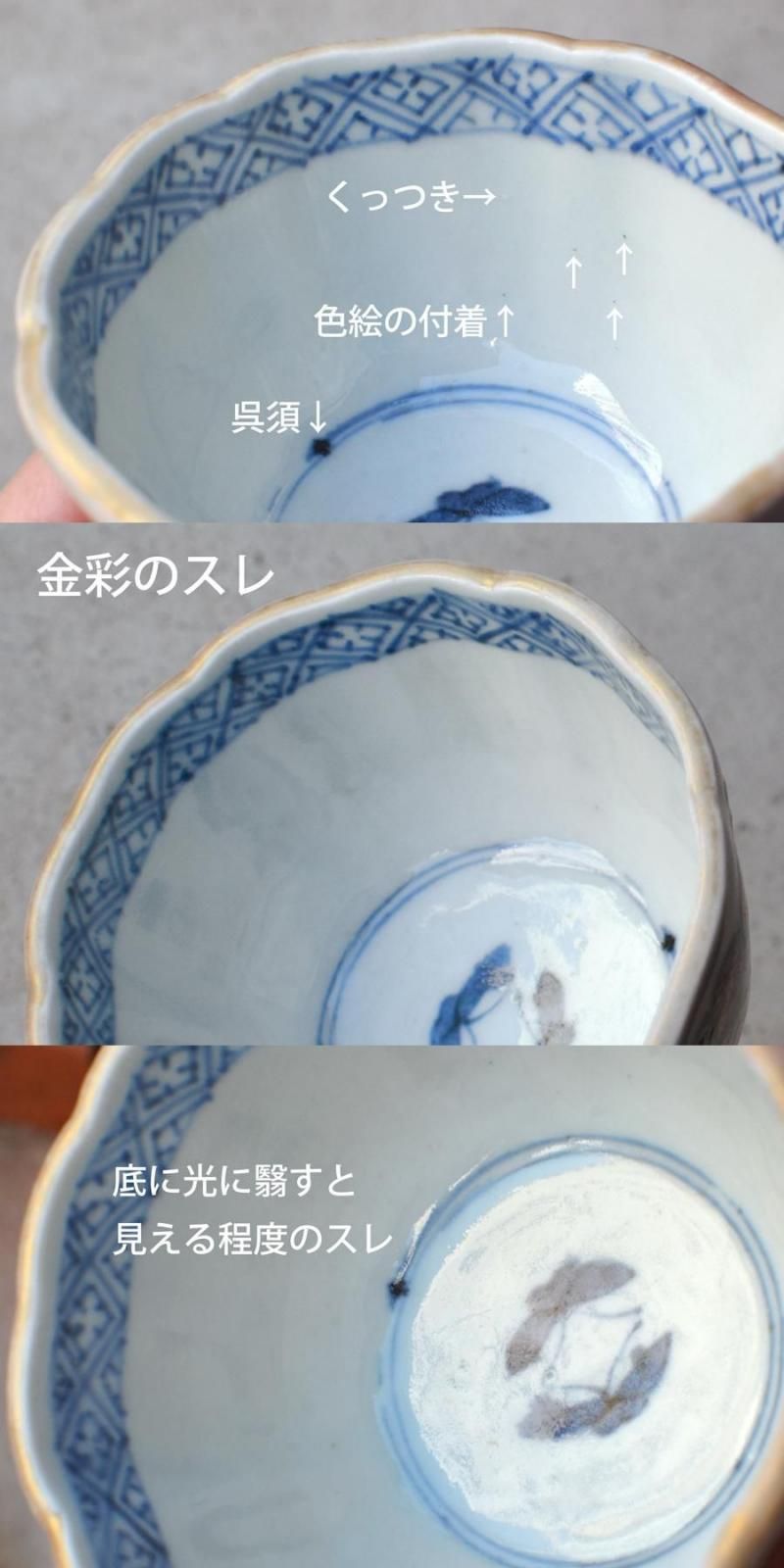 また色絵や金彩にスレ、光に翳すと見える程度の薄い引っ搔き跡見込みに見受けられます。
